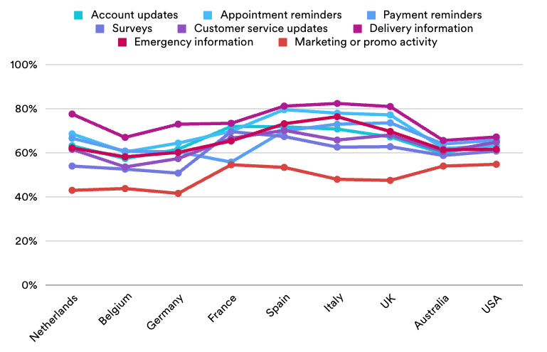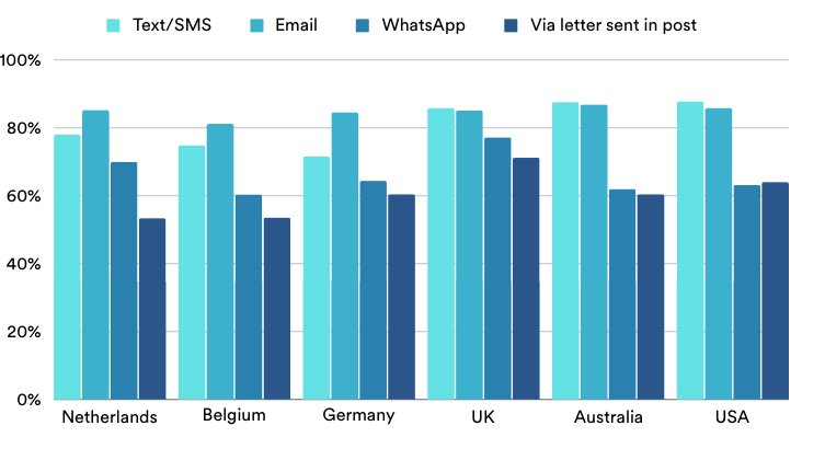 Interestingly, preferences for appointment reminders vary across regions. In Belgium, consumers express a strong inclination for email notifications, but what’s intriguing is that a significant portion of this demographic also favors SMS reminders. This trend is not unique to Belgium; it resonates across Europe. In countries like the UK, USA, and Australia, SMS has triumphed as the preferred medium for receiving appointment reminders. In a world where digital communication channels abound, SMS has emerged as the steadfast guardian of time-sensitive notifications, earning the trust and preference of consumers far and wide.